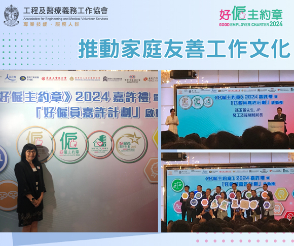 勞工署於9月24日舉行 《好僱主約章》2024嘉許禮暨 「好僱員嘉許計劃」啟動禮,勞工及福利局局長擔任典禮的主禮嘉賓。 協會成為 《好僱主約章》2024簽署機構,獲授權使用約章標誌,以表揚協會推行良好人事管理措施;此外,同時獲授權使用象徵致力推動家庭友善工作文化的 「為你 『家』『友』好僱主」標誌。